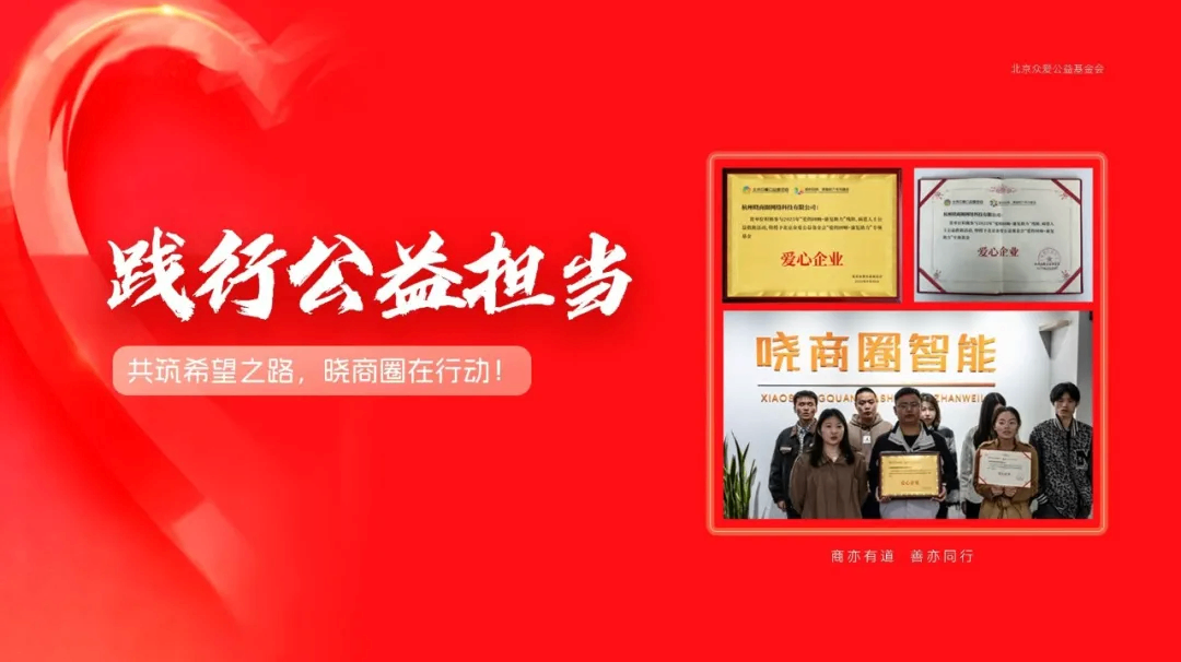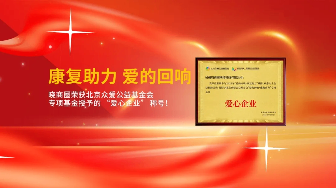 爱,是世界上最动听的回响。近日,晓商圈因对“爱的回响·康复助力”专项基金的鼎力支持与突出贡献,被北京众爱公益基金会正式授予“爱心企业”称号。这份荣誉,是对我们公益初心的回响,更是我们践行社会责任路上最温暖的勉励。